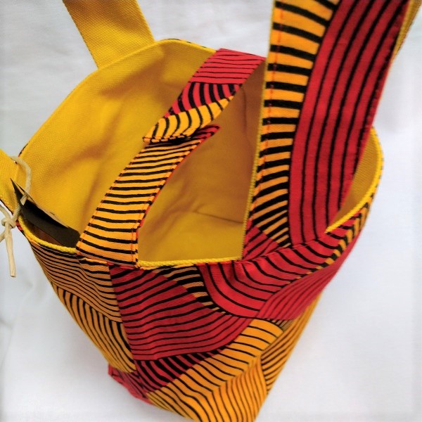 アフリカ布と帆布のリバーシブルになっています。 マグネットホックがついています。